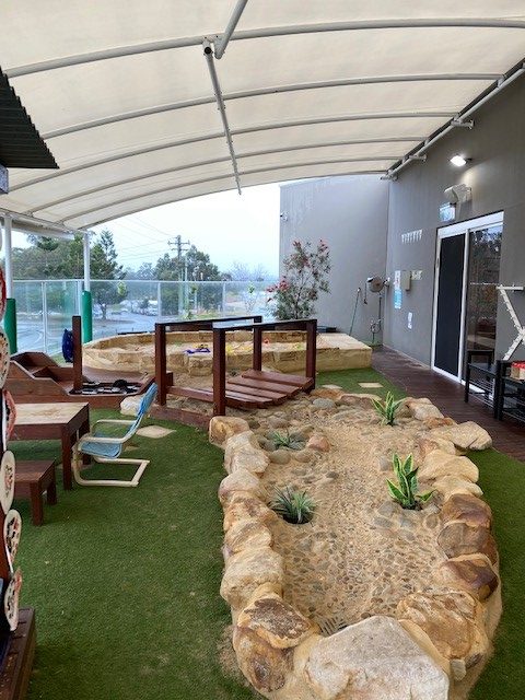 All outdoor areas have age-appropriate climbing structures and grass mounds as well as foot paths for children who want to ride their bikes. Other fixtures include slippery dips, obstacle courses, stepping stones, dry creek beds, wooden bridges, cubby houses, boat structures and timber deck stages. We also have a speaker system that plays music so youngsters can move and groove as they play.